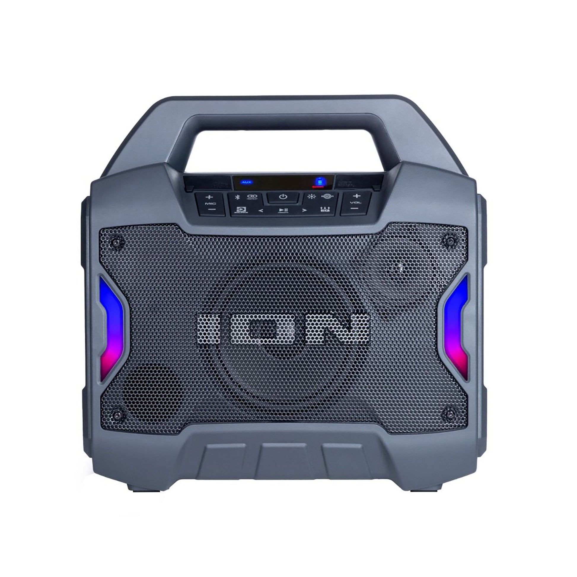 Bluetooth wirelessly streams audio from an enabled device. Delivers 50 hours of battery life for long lasting fun. 50W Sound system with 6.5" woofer and 2" tweeter. Ion Sound XP app - control audio and lighting functions. IPX5 Rated water resistant so it is safe in the rain or by the pool. Multi-colored lights dance in time to the music. FM Radio with 10 presets. Voice prompts help guide you through Bluetooth pairing. Wireless Stereo-Link - connect an additional Game Day speaker. Aux input plays non-Bluetooth devices. Includes power cable.